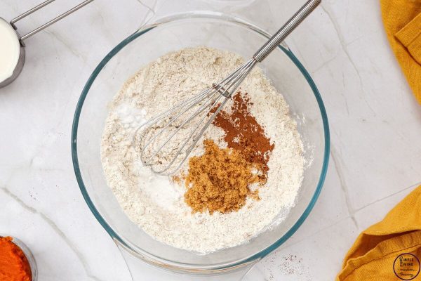 In a large mixing bowl, whisk together the dry ingredients – plain flour, baking powder, bicarbonate of soda, cinnamon, nutmeg and sugar.
