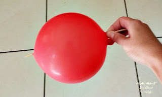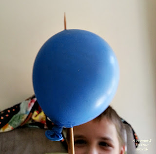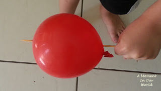 Yes, this did happen, the first four times. I was able to get the skewer through one end and it would always pop the balloon when trying to get it out. You need to make sure that you try to push the skewer out in the right place!! Then it works. I did it a couple of times, then R asked if he could have a go. He got it first time!! The second time he popped the balloon.What you need: