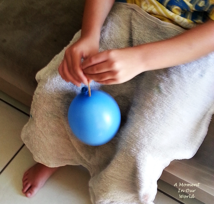 Yes, this did happen, the first four times. I was able to get the skewer through one end and it would always pop the balloon when trying to get it out. You need to make sure that you try to push the skewer out in the right place!! Then it works. I did it a couple of times, then R asked if he could have a go. He got it first time!! The second time he popped the balloon.What you need: